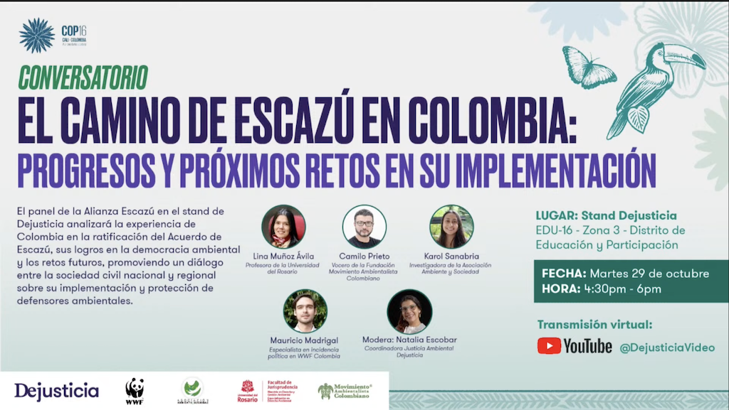 La Alianza Escazú, en el stand de Dejusticia en la COP16, analizará la experiencia de Colombia en la ratificación del Acuerdo de Escazú, sus logros en la democracia ambiental y los retos futuros, promoviendo un diálogo entre la sociedad civil nacional y regional sobre su implementación y protección de defensores ambientales.