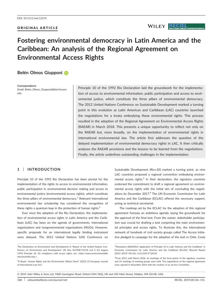 Este informe analiza los esfuerzos de América Latina y el Caribe para implementar el Principio 10 de la Declaración de Río de 1992, que promueve el acceso a la información, la participación pública y el acceso a la justicia ambiental. Es una base clave para comprender el origen y evolución del Acuerdo de Escazú.